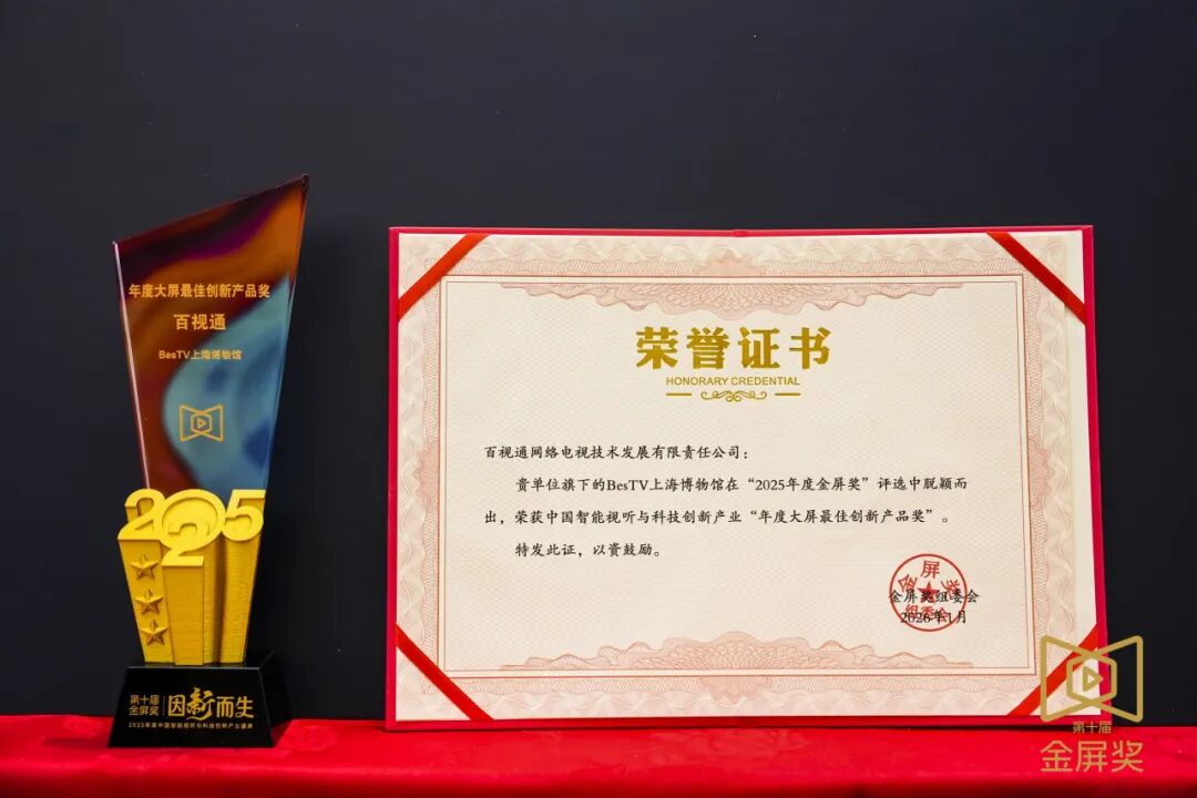 此次荣获“年度超高清视频产业贡献奖”,标志着百视通在超高清领域的长期深耕获得行业认可。作为大屏视听领域的领军者,百视通始终以创新为驱动,以技术为基石,不断探索新技术、新产品与新模式。2025年,百视通持续深化超高清技术与产业生态融合,积极推动国产HDR Vivid与Audio Vivid自主音视频标准的规模化落地与生态共建,储备近3000小时超高清内容;在生产变革上,通过全链路技术体系与“文心雕龙AI智创平台”,实现内容生产效率与质量的跃升,驱动内容生产向高清化、智能化转型;在应用拓展上,更以“BesTV上海博物馆”、百视通云游戏等创新实践,将超高清技术从视听享受延伸至文化沉浸、互动娱乐等多元场景,打破传统体验。
